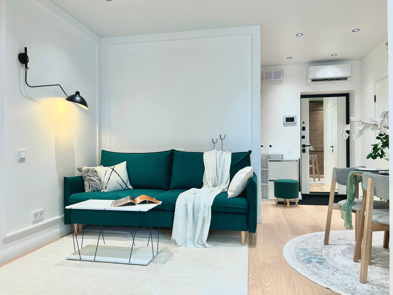 Гостиная — это не просто диван и телевизор, а набор сценариев. Глубокий диван на ножках (чтобы не мешать будущему роботу-пылесосу), мобильный свет, мягкий ковёр, читающийся как отдельная зона.