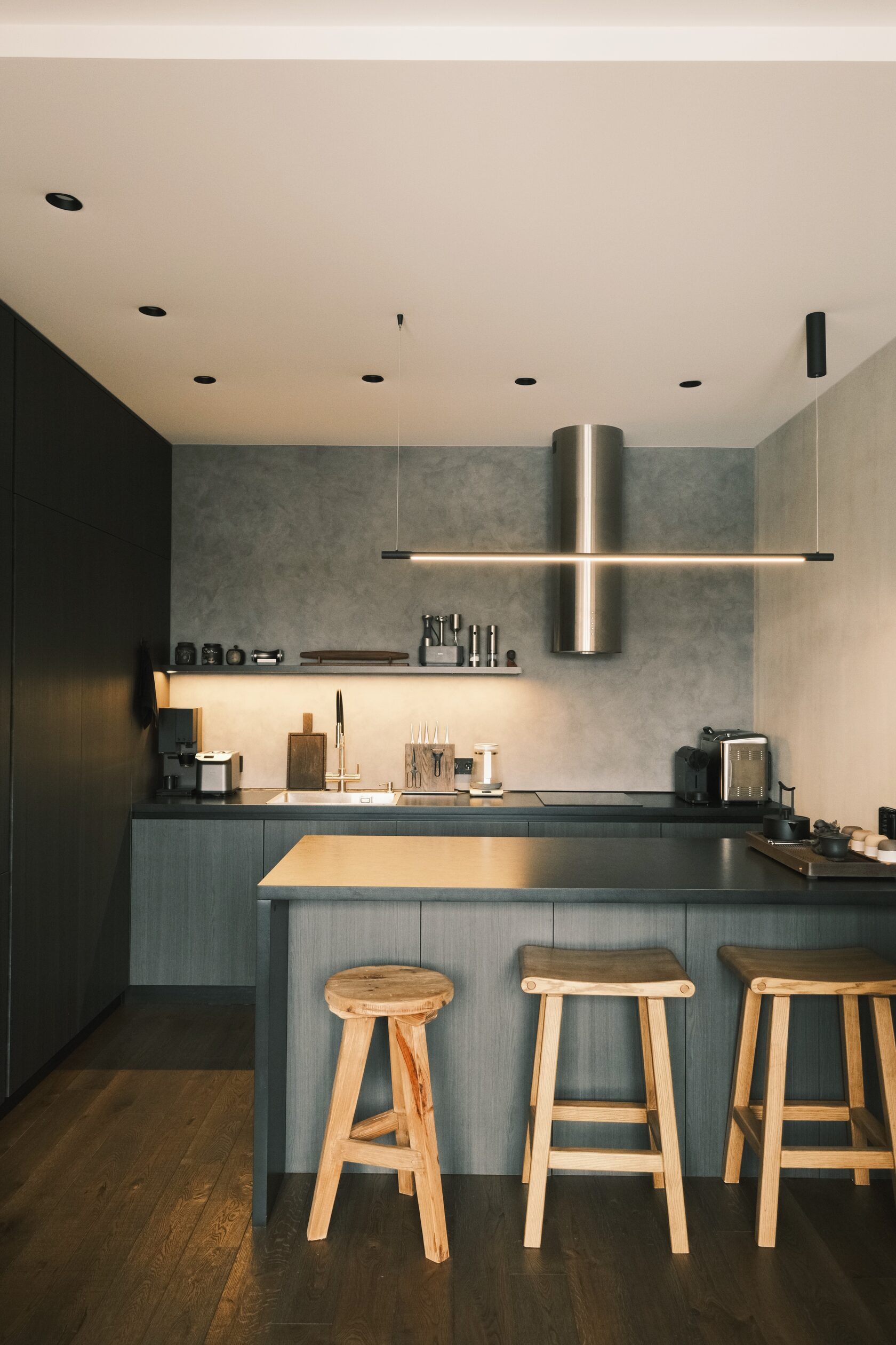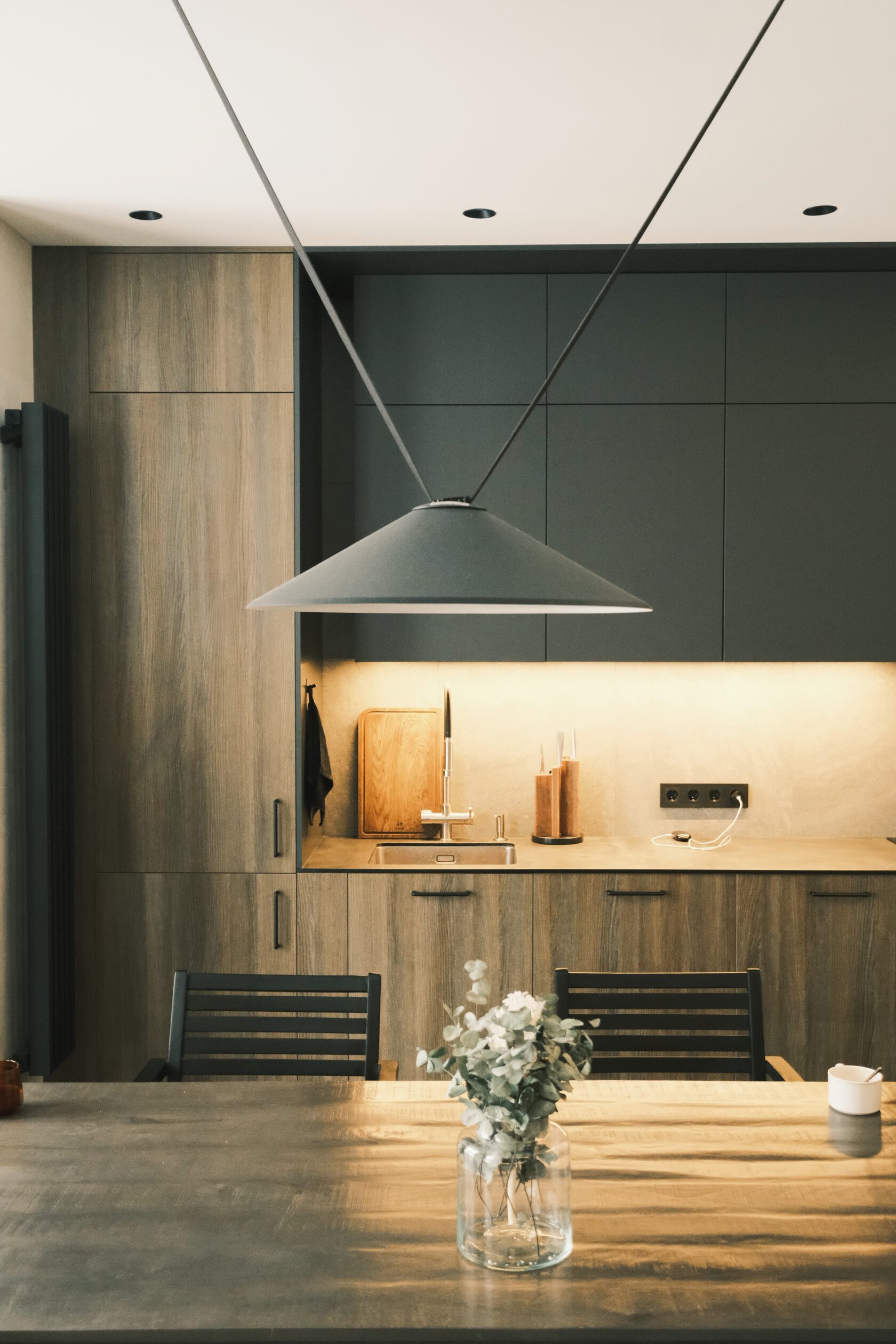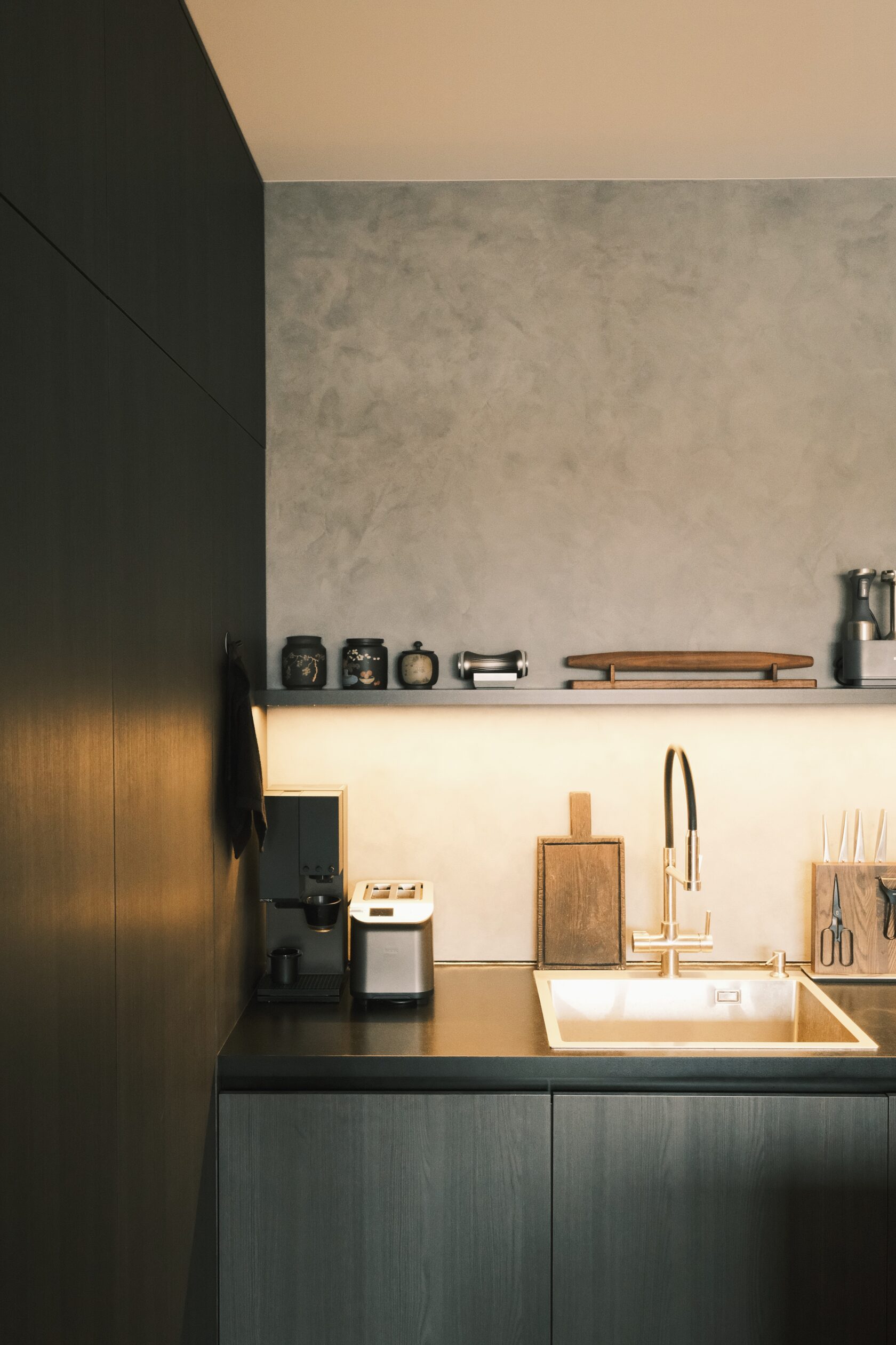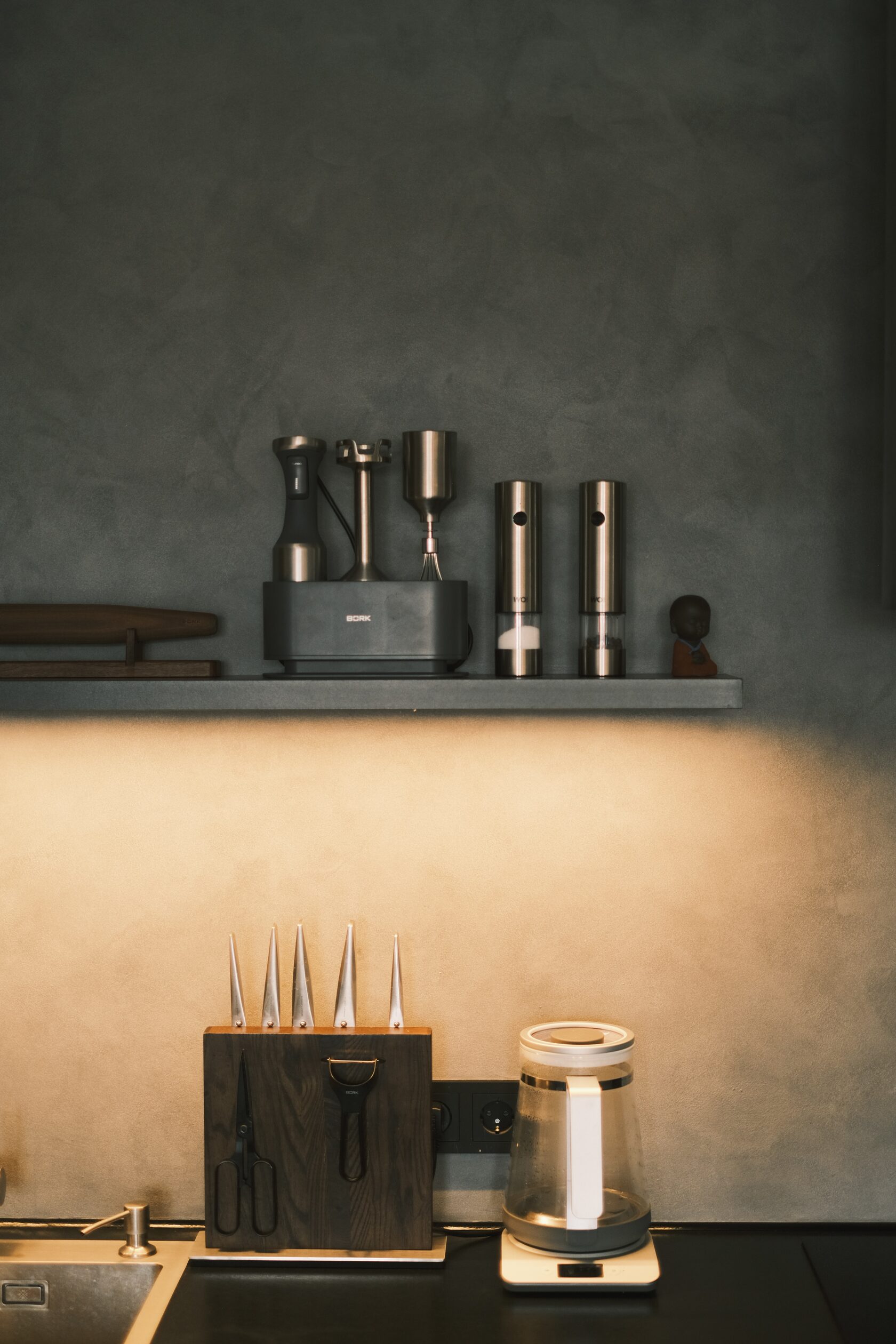 На столешнице — техника, но она не превращает кухню в «выставку проводов». Паша продумал, чтобы предметы одновременно решали эстетику и порядок: