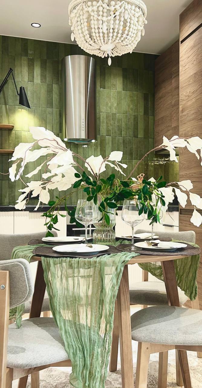 Зелёный фартук из плитки Equipe стал цветовой точкой отсчёта — именно от него выстраивалась вся палитра: дерево, белые поверхности, текстиль и ковёр в обеденной зоне.