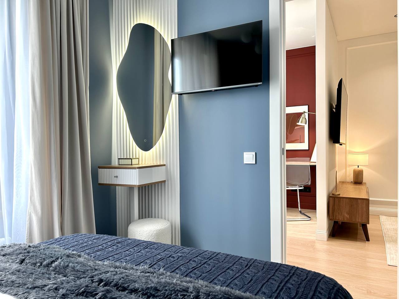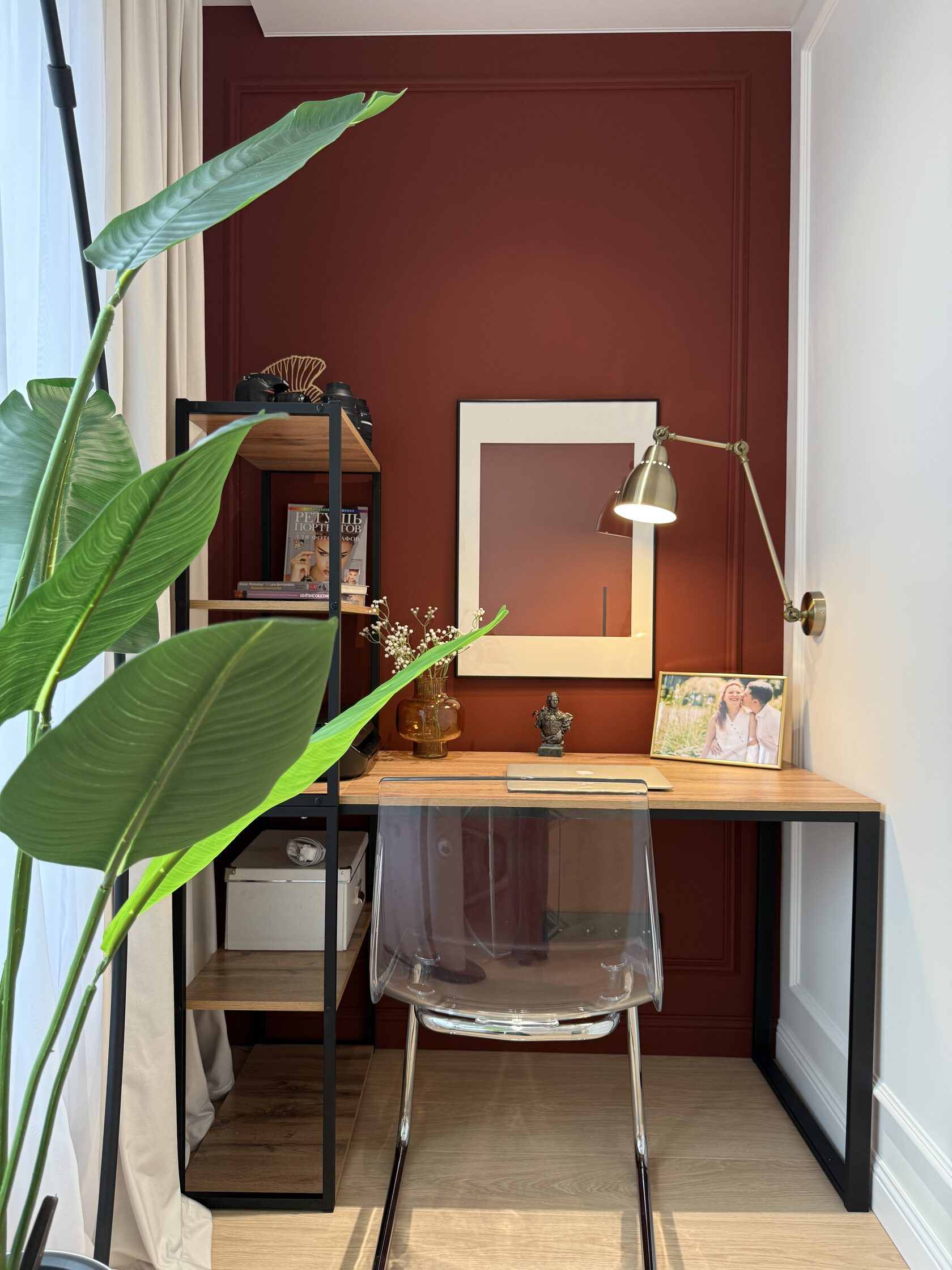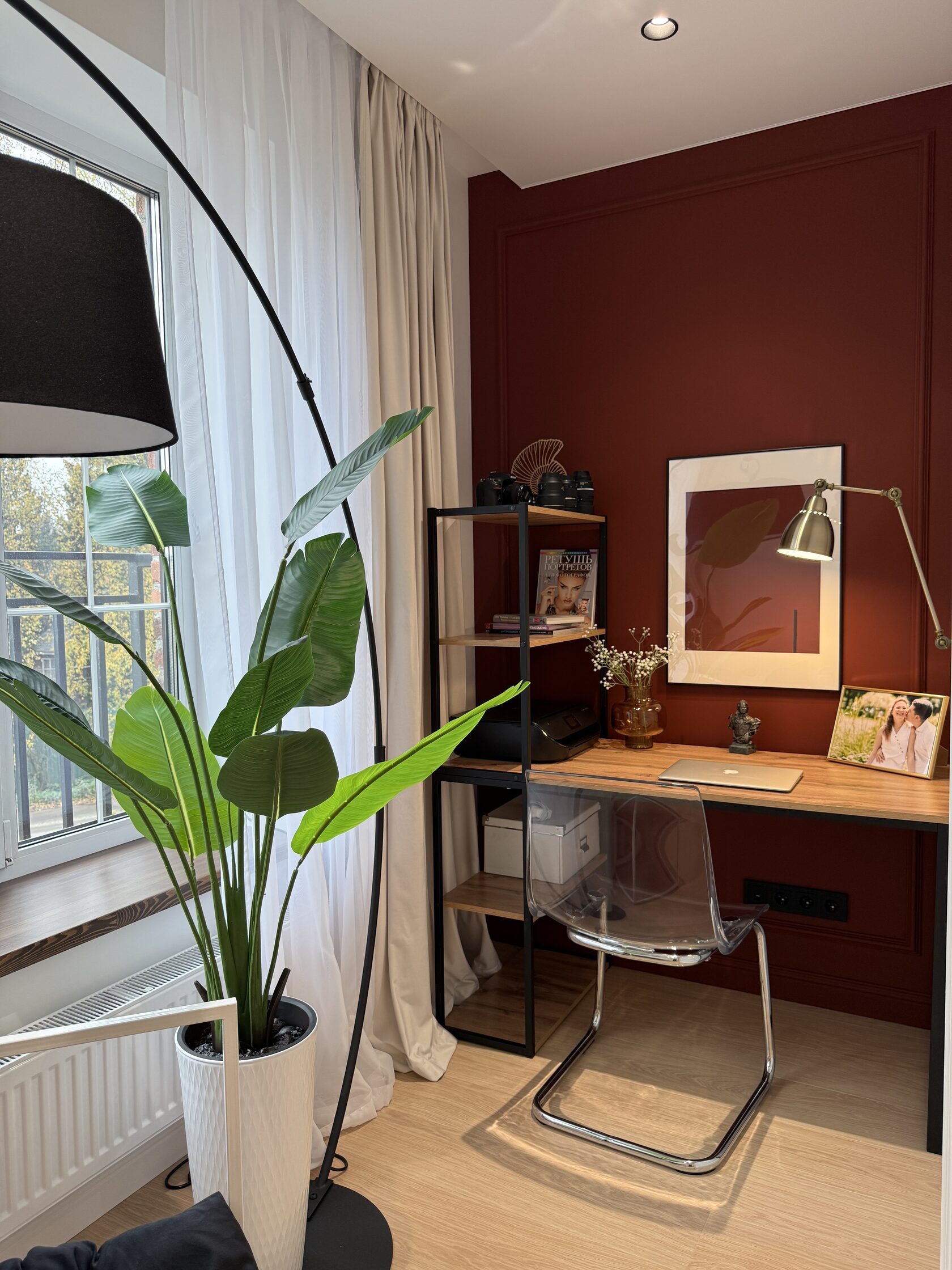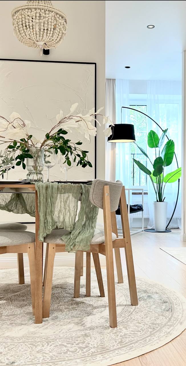 Даже ошибка — неверно рассчитанный размер стола — в итоге сыграла на пользу интерьеру: уменьшенная модель позволила корректно повесить шторы и сохранить пропорции стены.