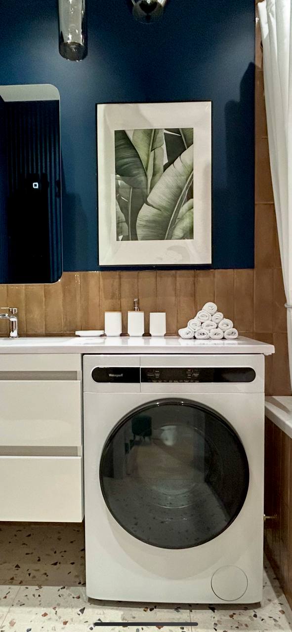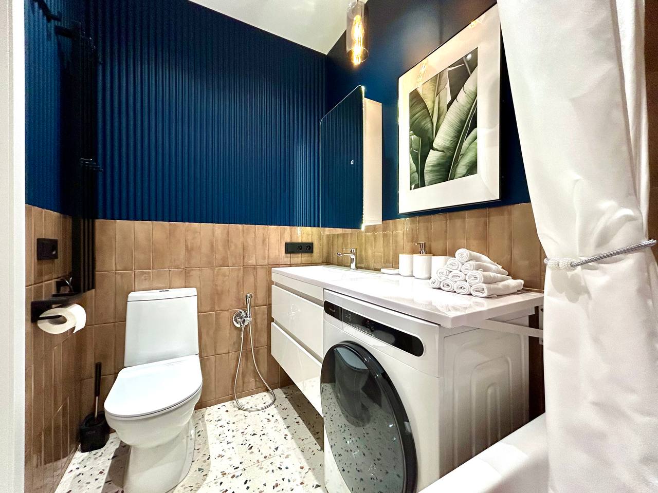 Ванная комната строилась не от моды, а от плитки. Тёплый беж как база — практичный и немаркий. В противовес ему — глубокий синий акцент, выбранный по цветовому кругу Иттена. Решение смелое для небольшого помещения, но именно оно добавляет интерьеру глубины и характера.
