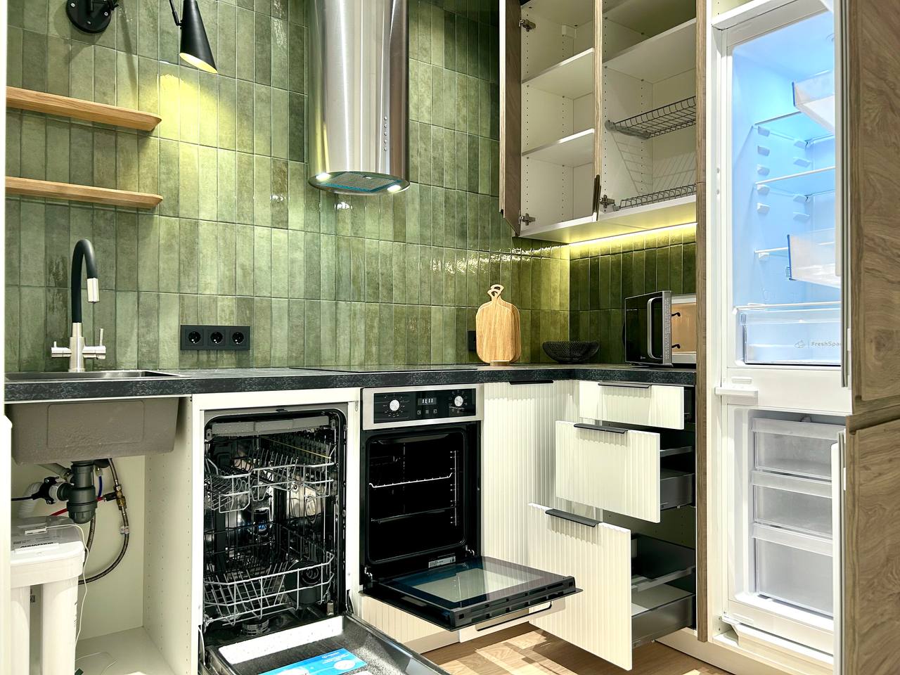 Кухня выглядит как полноценная, хотя вся техника здесь — формата 45 см. Духовой шкаф, посудомоечная машина, мойка — всё выверено до сантиметра. Компоновка настолько грамотная, что ограниченный размер не считывается визуально.