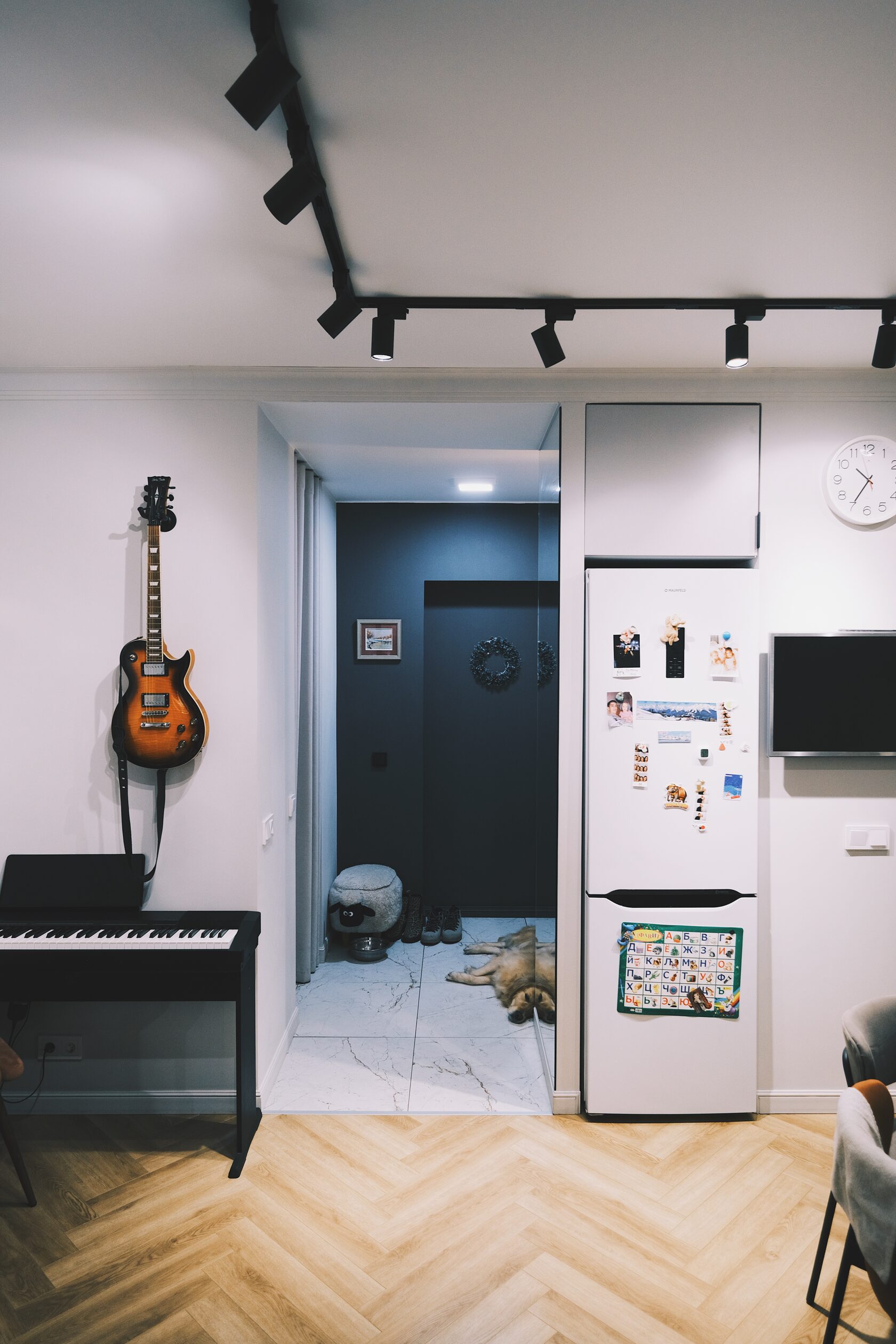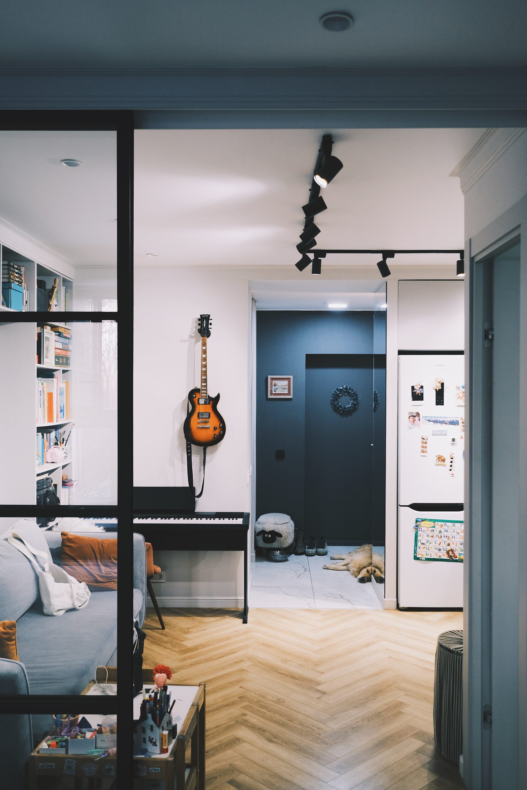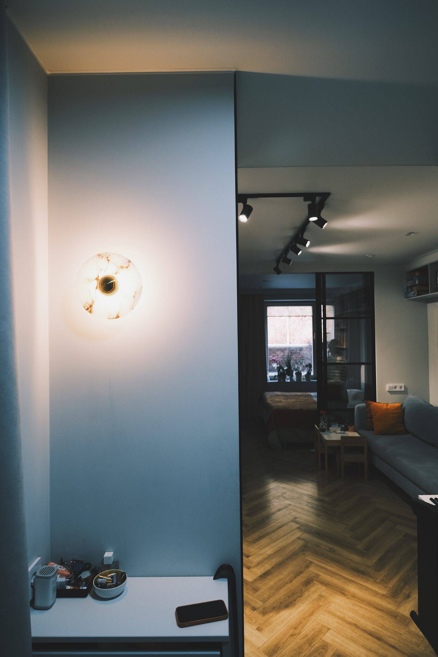 Изначально планировка задумывалась иначе: кухня должна была стоять у стены с окном, а гостиная — в глубине. Но в последний момент выяснилось, что стояк на этом этаже транзитный и подключиться к нему невозможно. Пришлось быстро менять сценарий: спальни оставили как были, а кухню и гостиную поменяли местами.