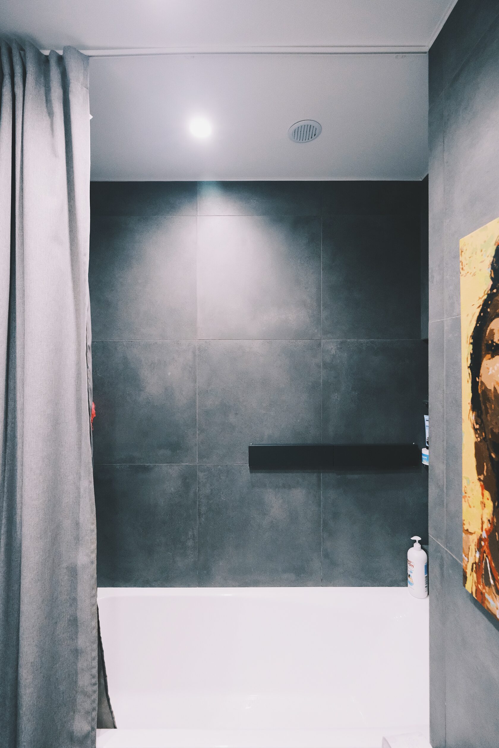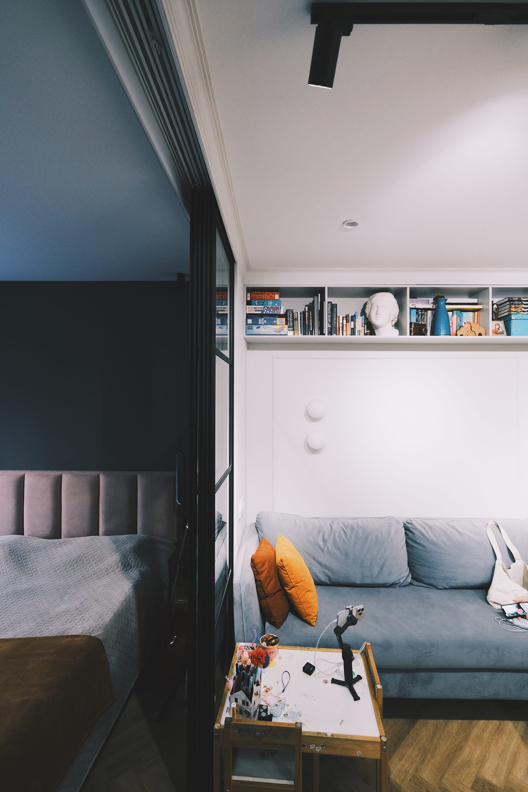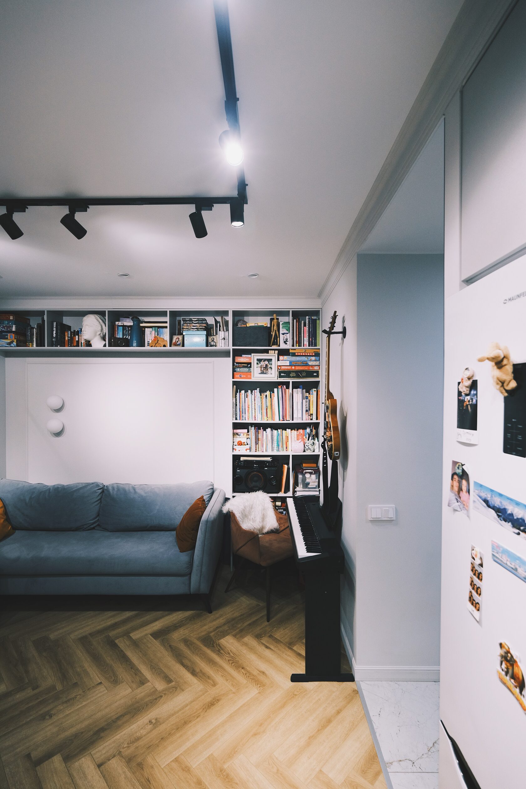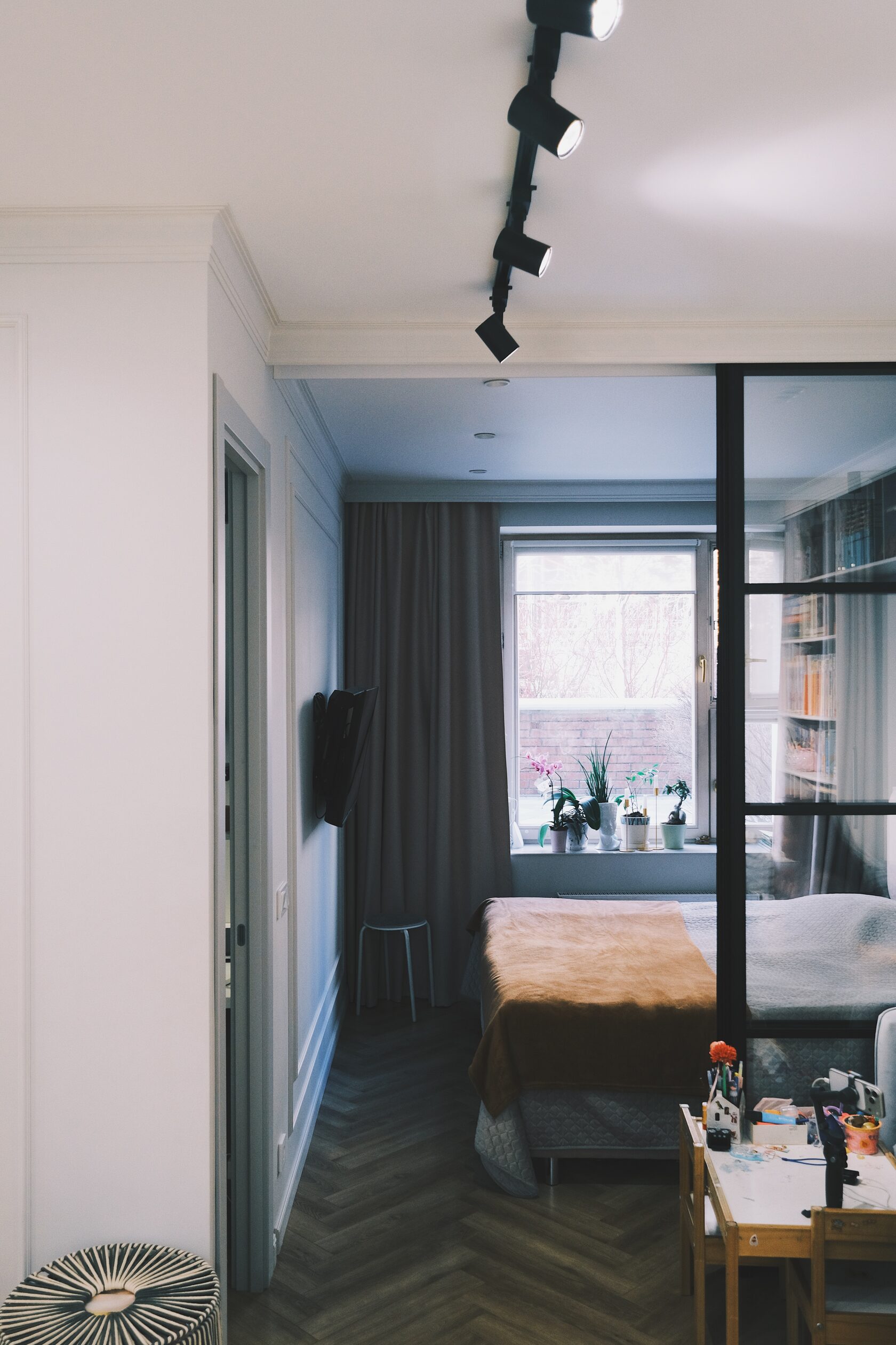Изначально планировка задумывалась иначе: кухня должна была стоять у стены с окном, а гостиная — в глубине. Но в последний момент выяснилось, что стояк на этом этаже транзитный и подключиться к нему невозможно. Пришлось быстро менять сценарий: спальни оставили как были, а кухню и гостиную поменяли местами.