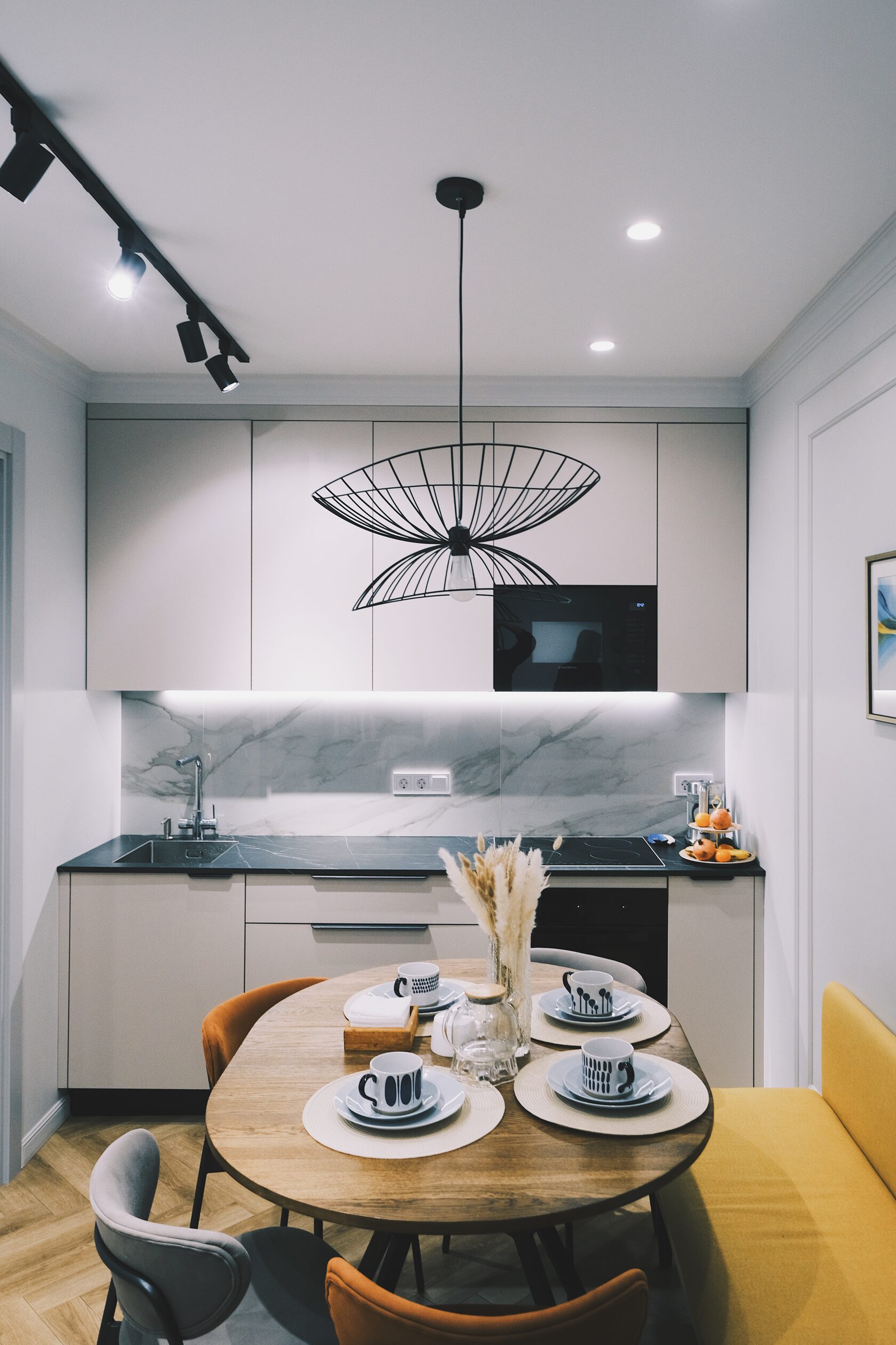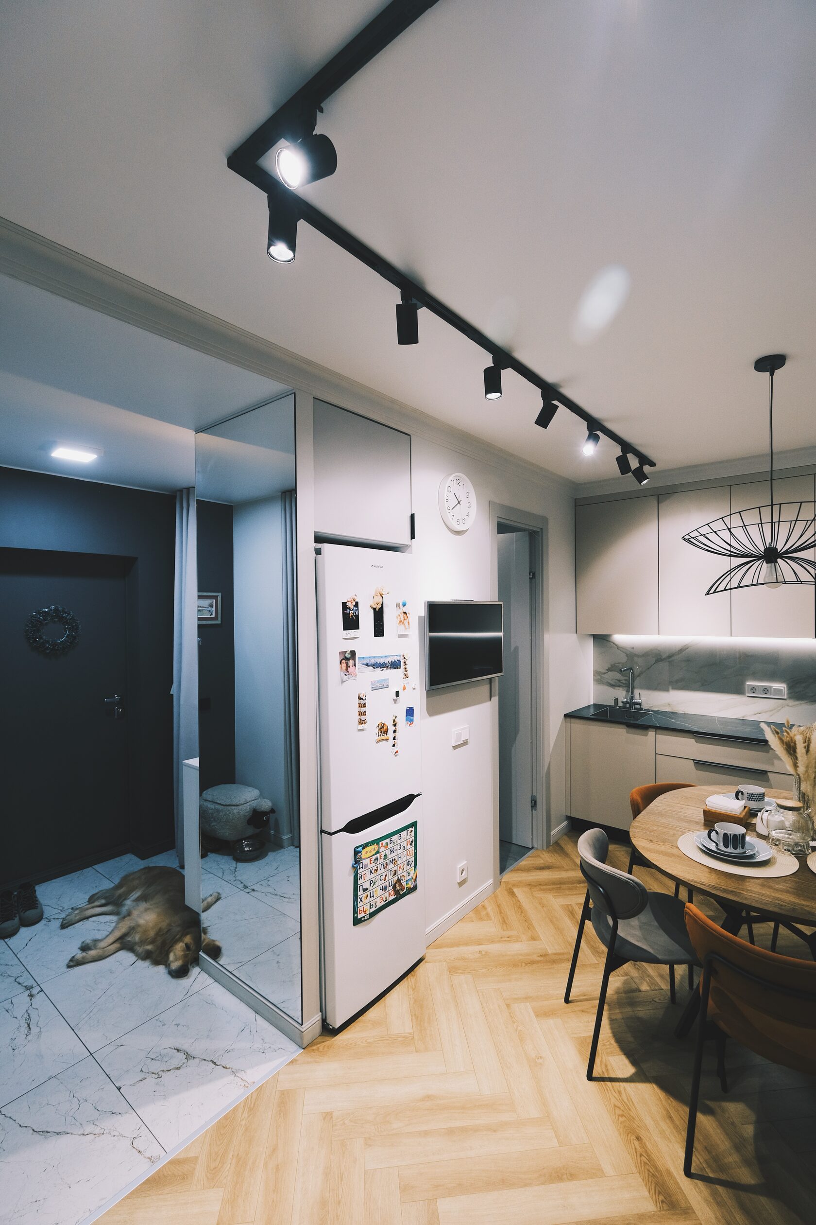Так кухня оказалась «внутренней», без окна. Компенсировать это помогли несколько решений: